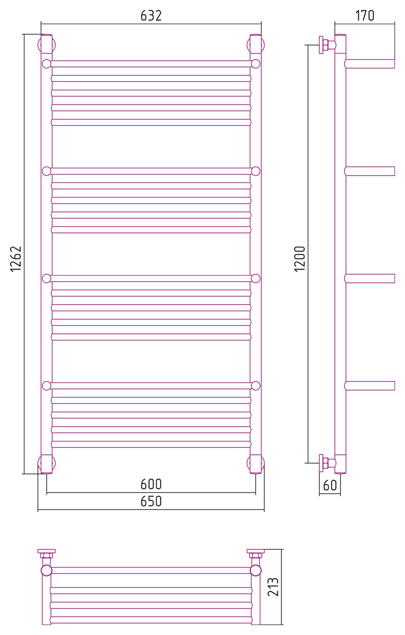 Водяной полотенцесушитель Сунержа, модели Богема, с внешними размерами 1200 мм в высоту, и 600 мм в ширину.