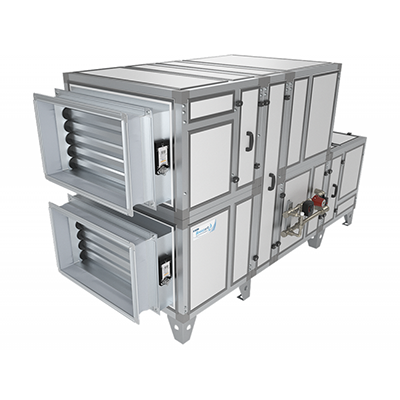 - Приточно-вытяжная установка с роторным рекуператором, фреоновым охладителем, водяным нагревателем и смесительным узлом с 2-х или 3-х ходовым клапаном (узел подбирается исходя из типа водоснабжения).