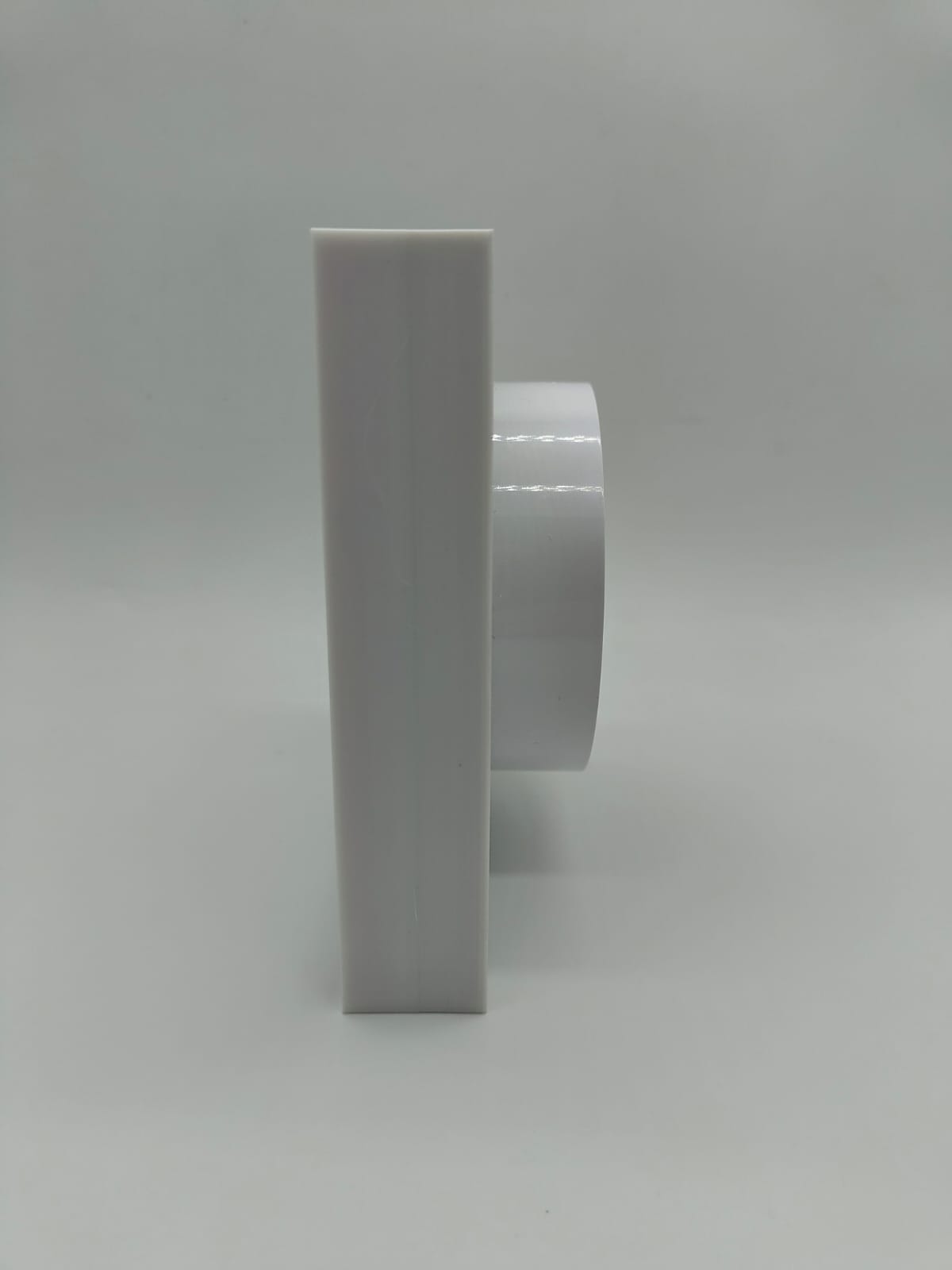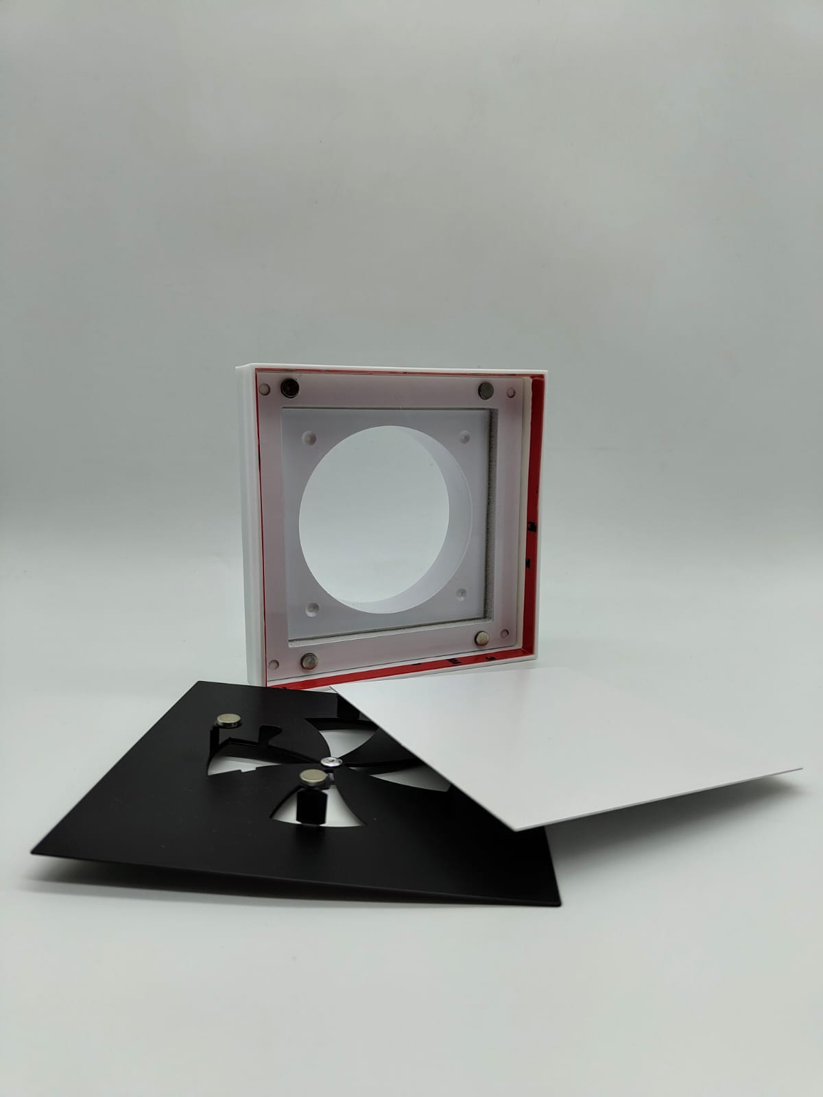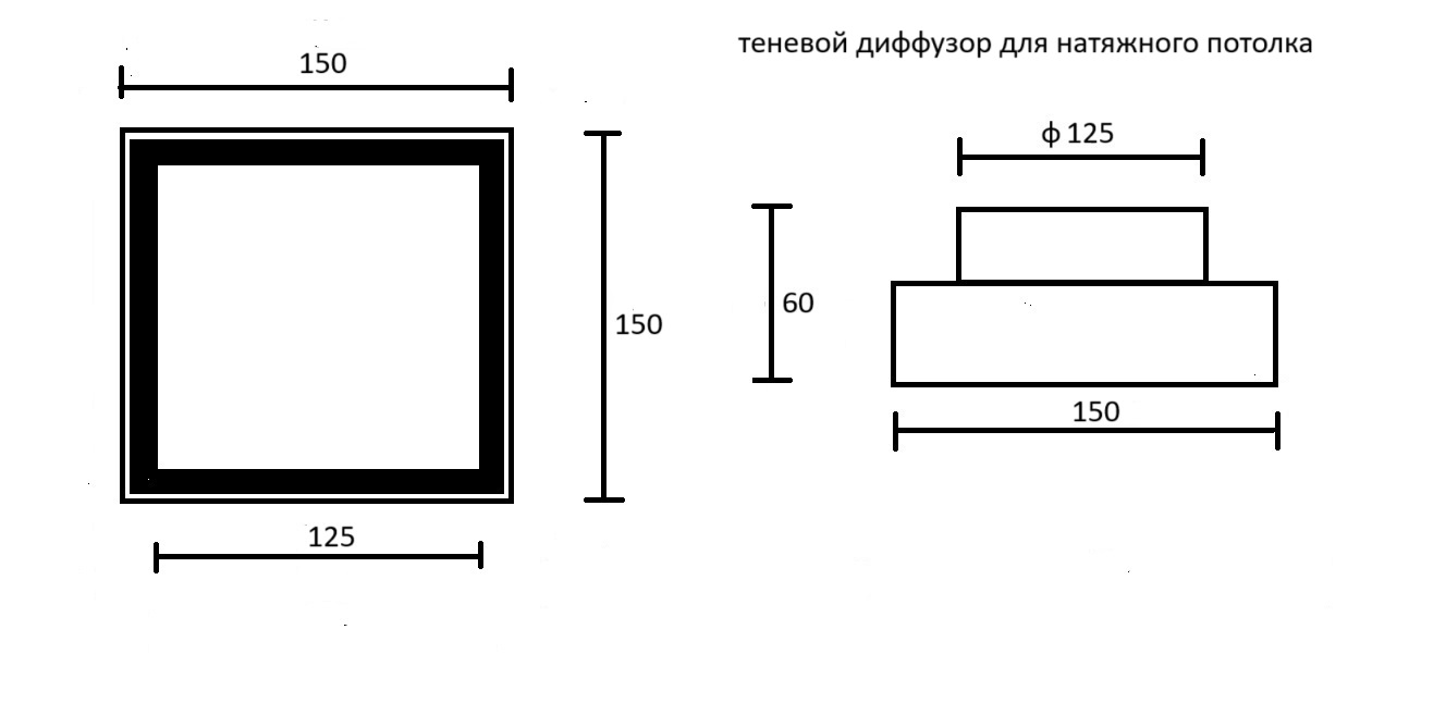 Диффузор состоит из пластикового перехода, металлической заслонкой, которой можно регулировать поток воздуха, либо полностью перекрыть его. К заслонке с помощью магнитов крепится декоративная квдратная панелька, которую можно покрасить в цвет потолка. Так же по ободку диффузора имеется надёжный двухсторонний скот марки 3М, к которому крепится полотно натяжного потолка.